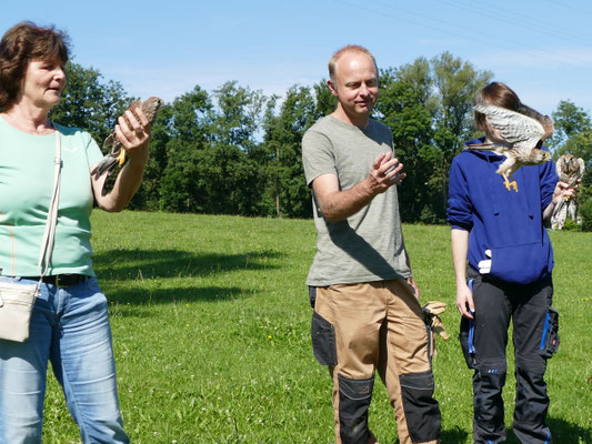 Die Turmfalkenfreunde erinnern sich: Am 24.Juni war es endgültig! Die 4 kleinen Falkenküken mussten ins Vogelpflegezentrum nach Mössingen gebracht werden. Der dringende Grund hierfür war, dass ihre Beinchen eine Fehlstellung bekommen hatten. Das kam so, weil die Falkenmutter das Material auf dem Boden des Nistkastens im Kirchturm bis zum Holzboden weg scharrte. Dadurch rutschten die kleinen Küken immer wieder aus und konnten sich nur noch krabbelnd mit den Flügelchen und den Füßchen fortbewegen. Wir fragten in Mössingen um Rat und darauf hieß es: sofort bringen! Also holten wir die 4 Küken aus dem Kasten und brachten sie hin. Dort wussten die erfahrenen Tierpfleger, was zu tun ist, denn dieses Phänomen gibt es des Öfteren. Die Beinchen wurden 14 Tage lang fixiert und so normalisierte sich die Aufnahme im Beckenknochen. Nun konnten sie sitzen und lernten später auch in einer großen Voliere das Ergreifen von Mäusen, denn das ist ihre Hauptnahrung. Am 31.07. war es dann soweit. Wir fuhren hin, um den großen Augenblick des Auswilderns mit zu erleben. Es klappte vorzüglich! Sie flogen davon, als hätten sie es schon immer gemacht. Es war ein schöner Augenblick, den davon fliegenden Jungfalken nachzusehen.